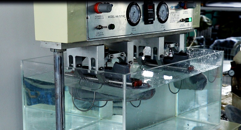 防水襪套測試是通過將空氣灌至襪套里,將襪套壓至水箱內以測試防水度。每一只防水襪套務必置于水槽中作充氣測試,防水襪套務必延伸至鞋子的舌翼頂端或防水線以上5毫米處,發現漏氣的襪套不可使用。